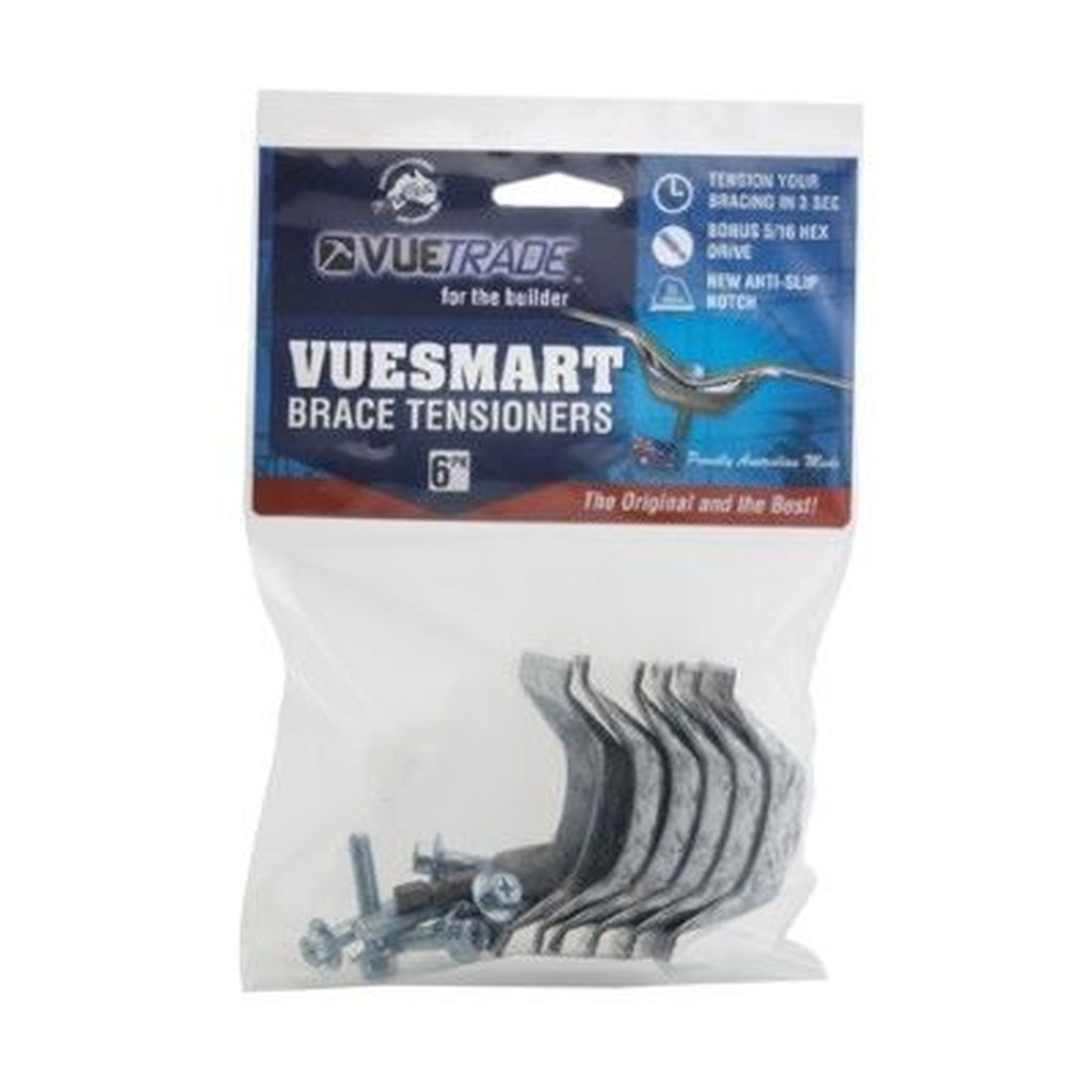 VUESMART Brace Tensioners are used to quickly and easily tension VUEBRACE Punched Builder’s Strapping after it has been installed on wall or roof framing.